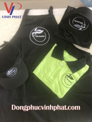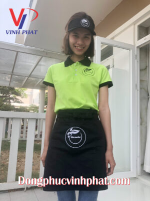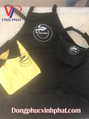 Bộ đồng phục quán cafe gồm áo thun quán cafe, tạp dề dài và tạp dề ngắn và nón nữa đầu được thêu logo vô cùng dể thương và cá tính.
