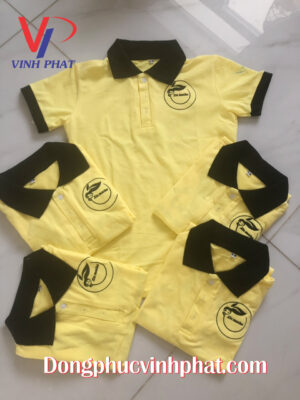 Về phần áo thun quán cafe được may với hai màu là xanh và vàng. Chiếc áo được công ty may Vĩnh Phát chúng tôi may bằng chất liệu vải cotton với độ mềm mịn và khả năng thấm hút mồ hôi cực tốt. Áo được thiết kế phối viền tay và cổ áo màu đen rất năng động và cá tính. Về logo, mặt trước logo được thêu phía bên ngực trái màu đen với đường chỉ thêu chắc chắn và sắc nét. Mặt sau áo được công ty may Vĩnh Phát chúng tôi in số điện thoại và địa chỉ để quảng bá thương hiệu hãng trà sữa