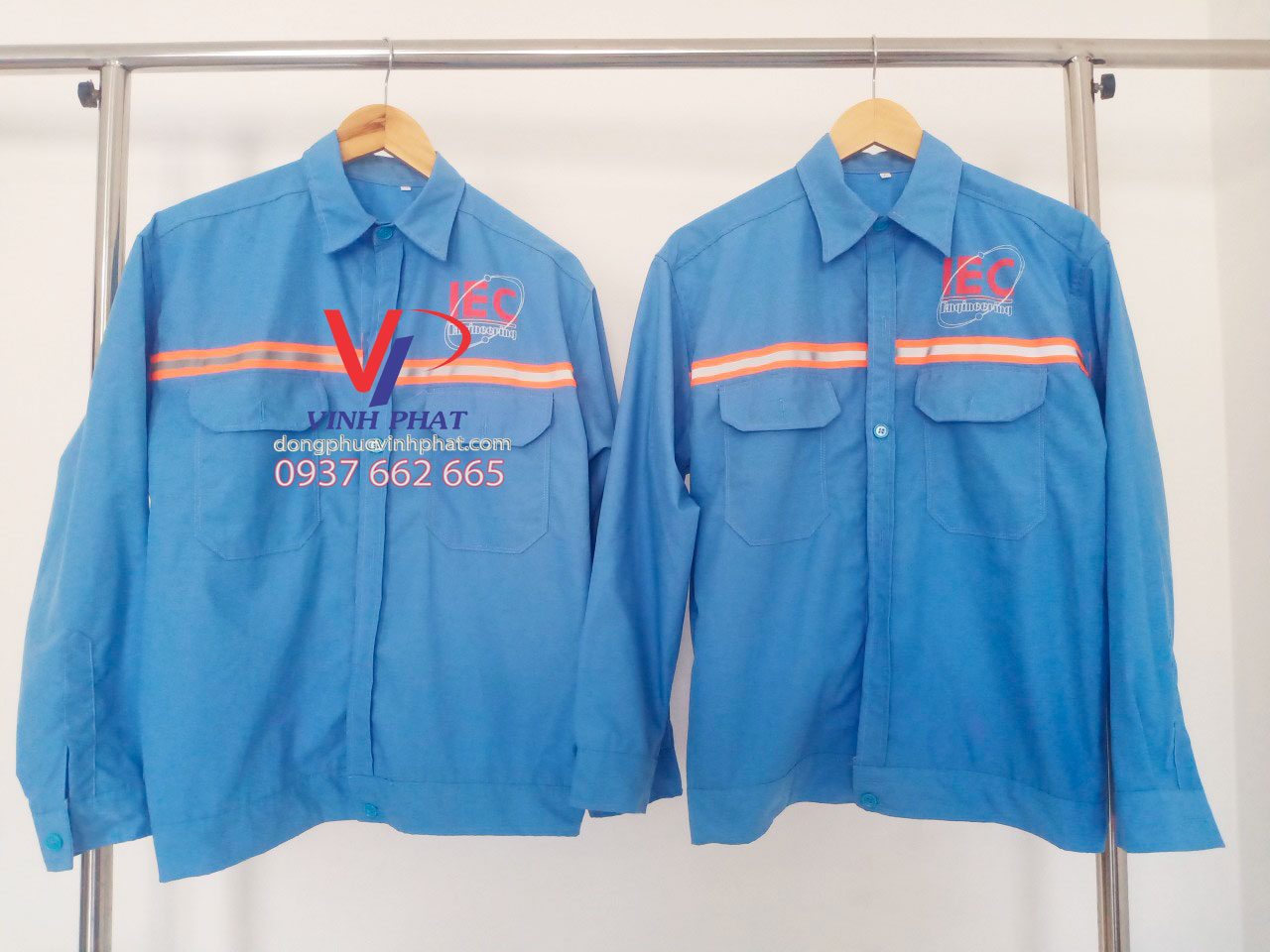 – Về màu sắc: Áo được may với gam màu xanh dương nhạt. Đây là màu sắc thường được lựa chọn để may áo bảo hộ cho công nhân xây dựng. Do tính chất công việc phải làm ngoài trời nên chọn màu này để trông dịu mát khi thời tiết nắng nóng, oi bức. Đặc biệt không thể thiếu đó chính là logo IEC mang tên tên và lĩnh vực hoạt động của công ty.