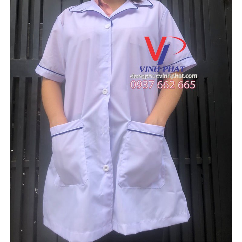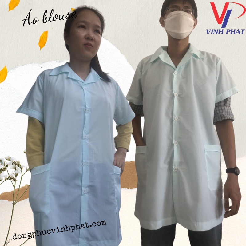 Áo có kiểu dáng giống như giống như áo blouse tay dài nhưng có thân ngắn và tay ngắn tạo cảm giác thoải mái khi làm việc. Thiết kế rộng rãi phù hợp với nhiều vóc dáng cơ thể khác nhau, áo trắng chuẩn với phần cổ bẻ, tay ngắn, phía trước có hai túi bên hông để bỏ tay vào hoặc đựng các vật dụng cá nhân hoặc vật dụng y tế cần thiết.
