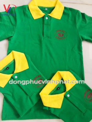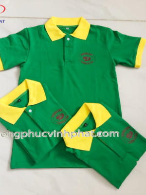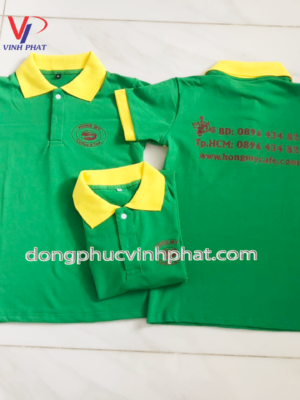 Áo thun quán cafe lần này được công ty may Vĩnh Phát may với tông màu chủ đạo là xanh lá cây kết hợp với tông màu vàng tạo sự nổi bật và ấn tượng cho chiếc áo.