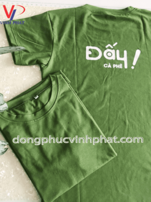 Áo thun đồng phục lần này được công ty may Vĩnh Phát may với tông màu chủ đạo là xanh đậu cây kết hợp với tông màu in là màu trắng tạo sự nổi bật và ấn tượng cho chiếc áo.