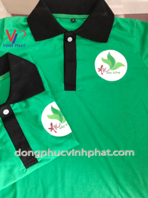 Đúng với tên của quán Mộc Cây Xinh chiếc áo thun quán cafe lần này được công ty may Vĩnh Phát chúng tôi sử dụng tông màu xanh lá cây in logo màu cùng với màu áo.