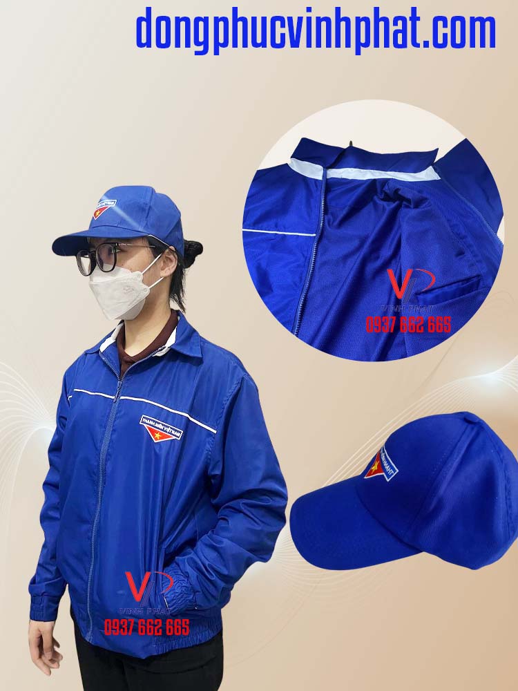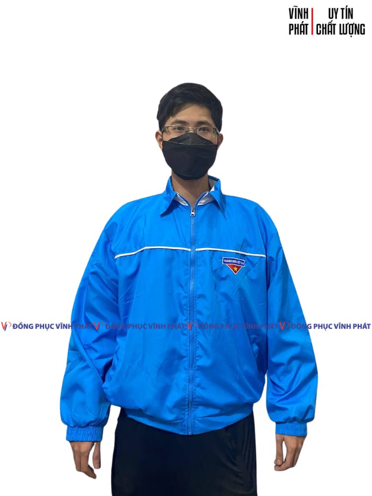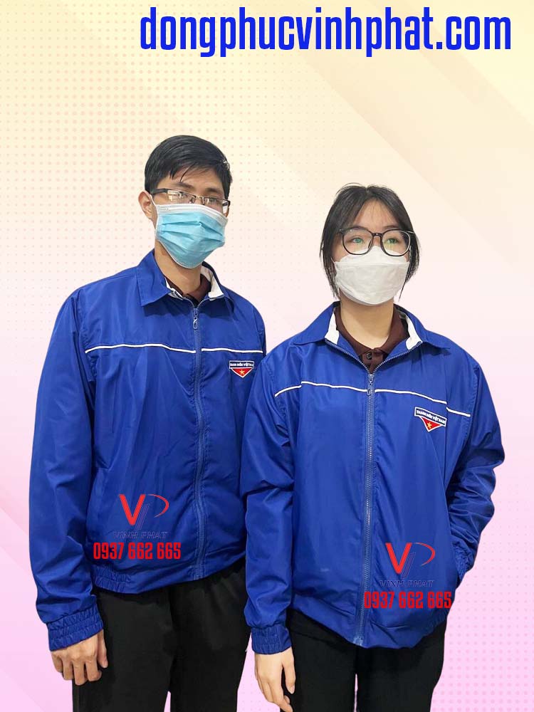 Áo khoác Đoàn màu xanh đậm, nhạt in/thêu logo sắc nét: tăng tính nhận diện tập thể