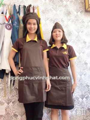 Chiếc áo được phối với màu vàng ở phần cổ áo và phần bo ở tay. Về tạp dề, tạp dề đồng phục nhà hàng quán được may dạng yếm có tăng đưa ở cổ giúp tăng giảm chiều dài. Phần trước bụng có túi rộng giúp bạn có để để đồ dễ dàng hơn. Tạp dề được Vĩnh Phát may với chất liệu kaki 65/35 – chất vải không quá thô tạo form dáng đẹp và tạo cảm giác dễ chịu cho người mặc.