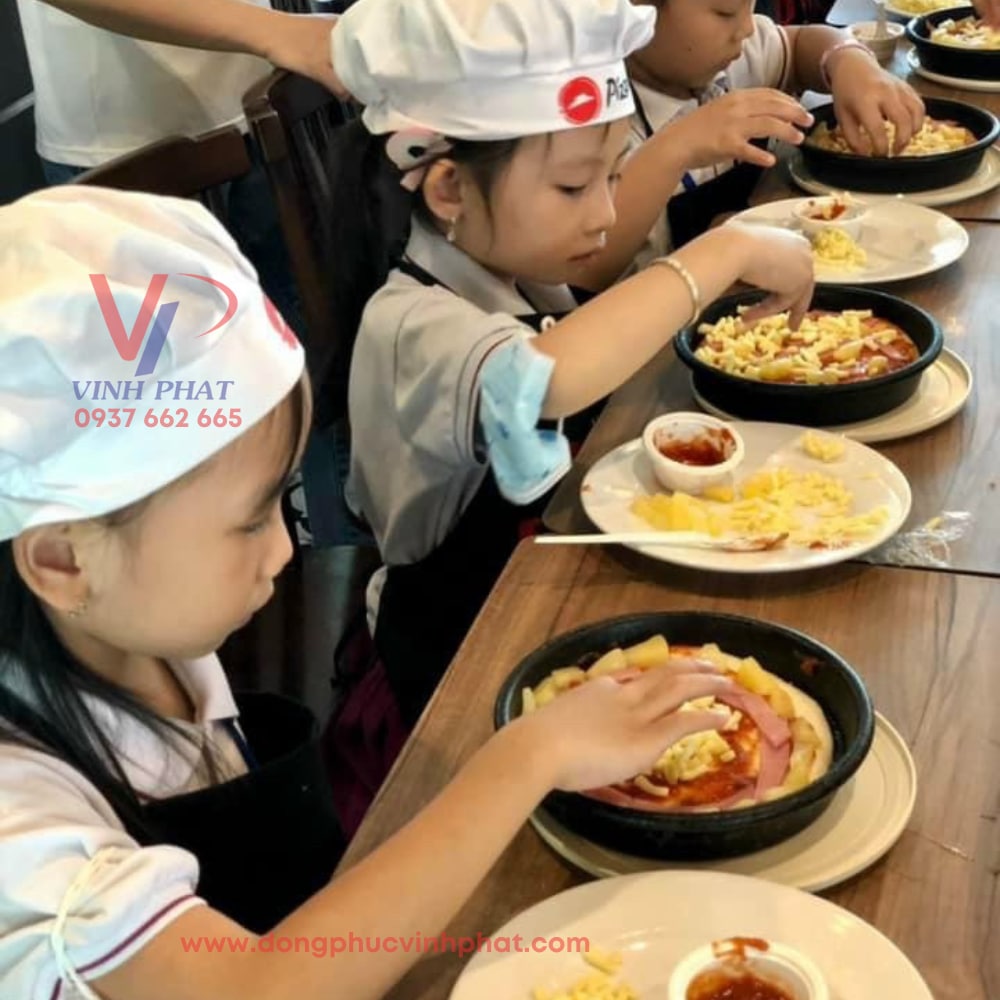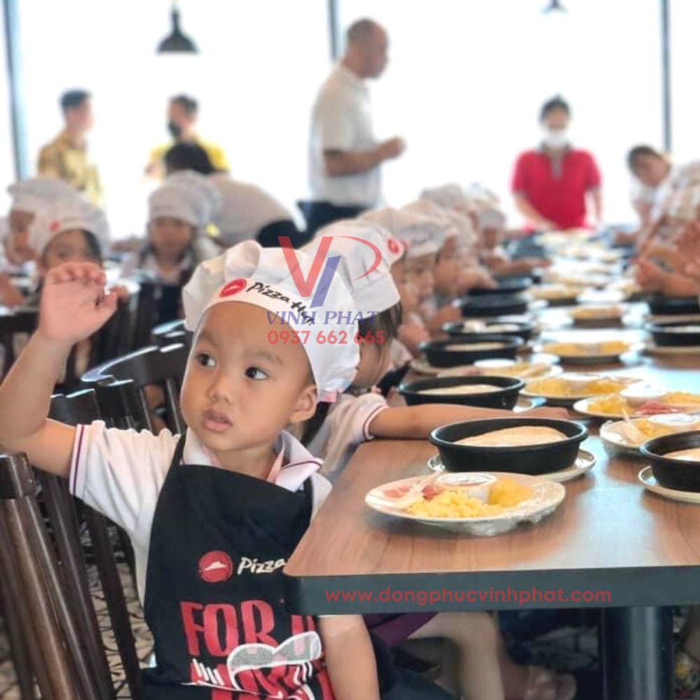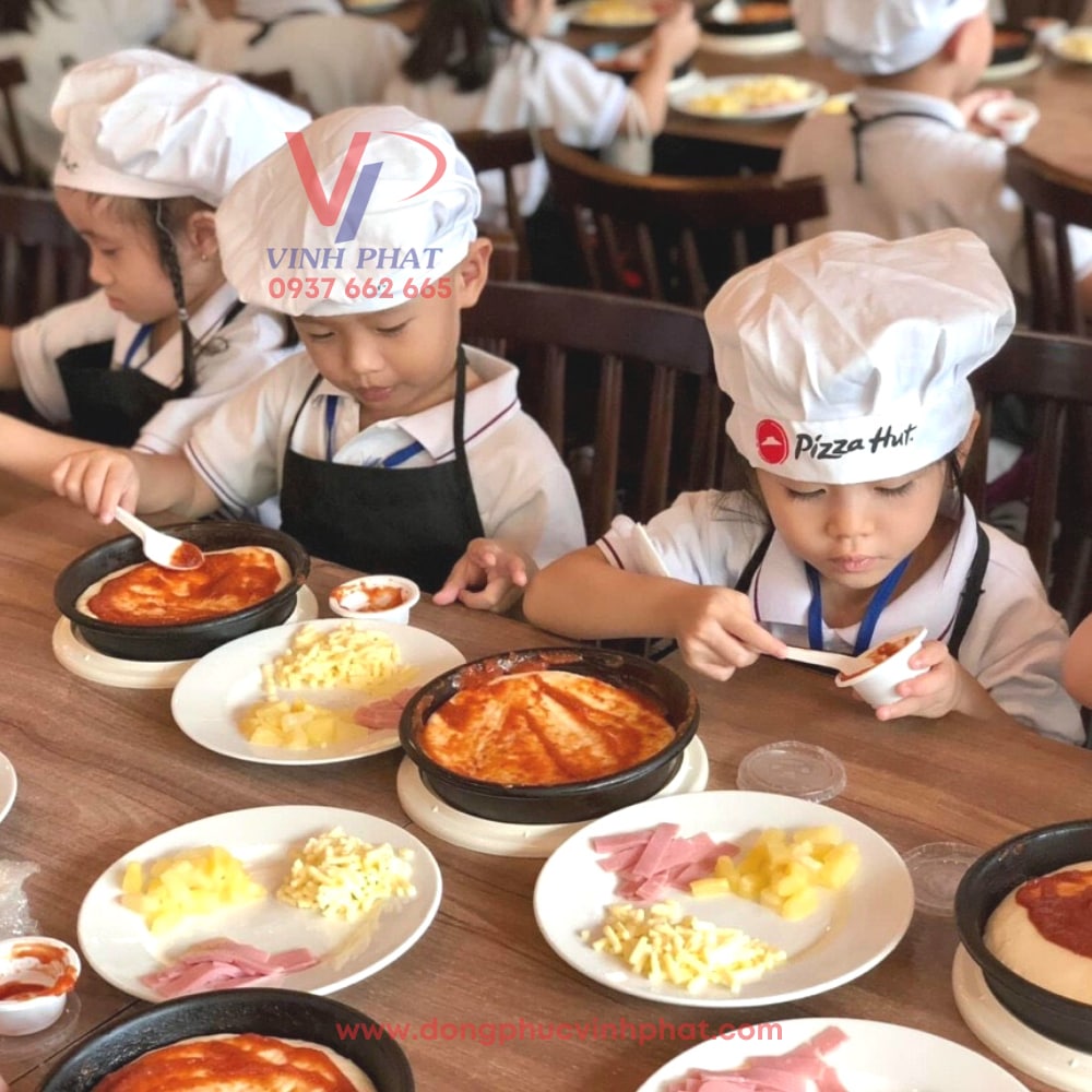 Sau cùng chính là sự kết hợp giữa bộ đồng phục mầm non và chiếc tạp dề cùng chiếc nón bếp dễ thương xinh xắn dành cho bé. Sự chú trọng trong hình thức trang phục và sức khỏe của các em thông qua các phụ kiện này cho thấy được sự tận tâm của nhà trường. Chiếc tạp dề đen in logo họa tiết đẹp mắt phối cùng với chiếc nón bếp nhỏ nhắn trắng tinh càng làm tăng thêm nét thẩm mỹ, dễ thương và sảng khoái cho các bé. Một sự chuẩn bị đơn giản và chu đáo nhưng lại tạo được một nét đẹp lớn cho các em trong quá trình hình thành và phát triển sau này của trẻ.