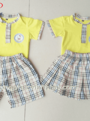Về thiết kế, áo được công ty may Vĩnh Phát chúng tôi thiết kế với áo cổ trụ có phối màu ở cổ áo và tay áo. Về quần, quần được may riêng hai kiểu dành cho nam và nữ. Đối với kiểu dành cho nam được chúng tôi thiết kế dạng quần đùi lửng có bo thun tạo cảm giác thoải mái cho các bé khi mặc còn về quần của bé gái được may dạng váy tạo sự nữ tính và dễ thương cho các bé.