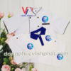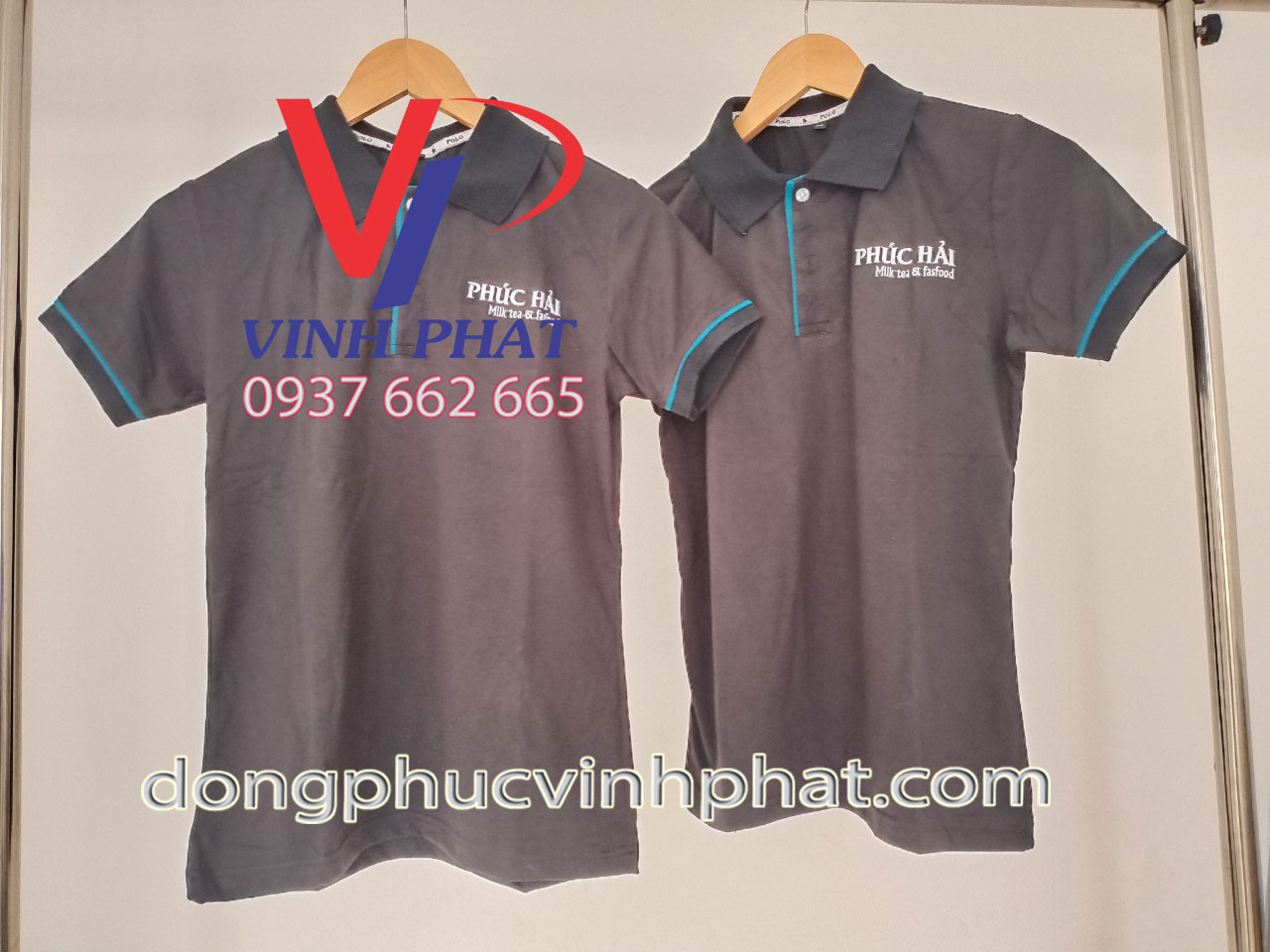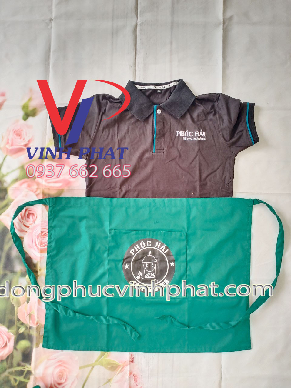 Đồng phục quán trà sữa bao gồm áo, mũ và tạp dề ngắn cột ngang eo. Chiếc áo được Vĩnh Phát sử dụng vải thun cotton 100% chất vải mềm mịn , thun co giãn 4 chiều , thấm hút mồ hôi tốt khiến cho người mặc có cảm thoải mái nhất. Cổ áo được thiết kế có cổ bẻ dạng sơ mi màu đen và phía trên ngực trái có in logo nhãn hiệu của cửa hàng.