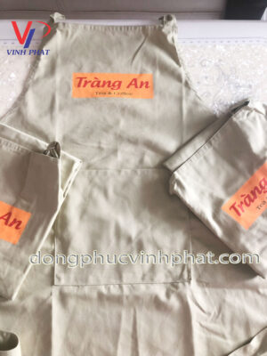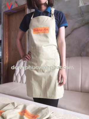 Chiếc tạp dề nhà hàng quán Tràng An với chất vải kaki 65/35 màu kem – chất vải dày dặn và cứng cáp nhưng vẫn có sự mềm mại và thoáng mát khi mặc.