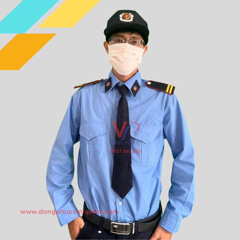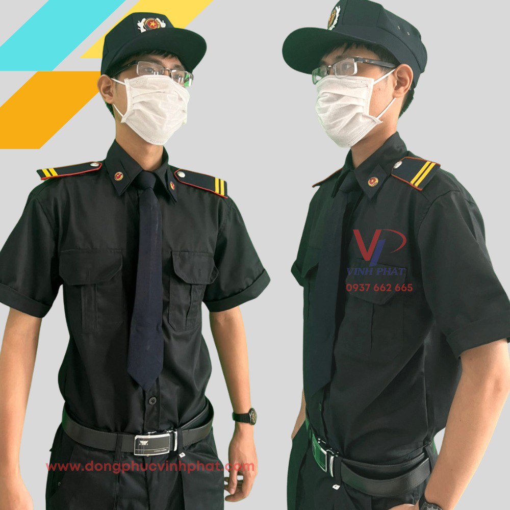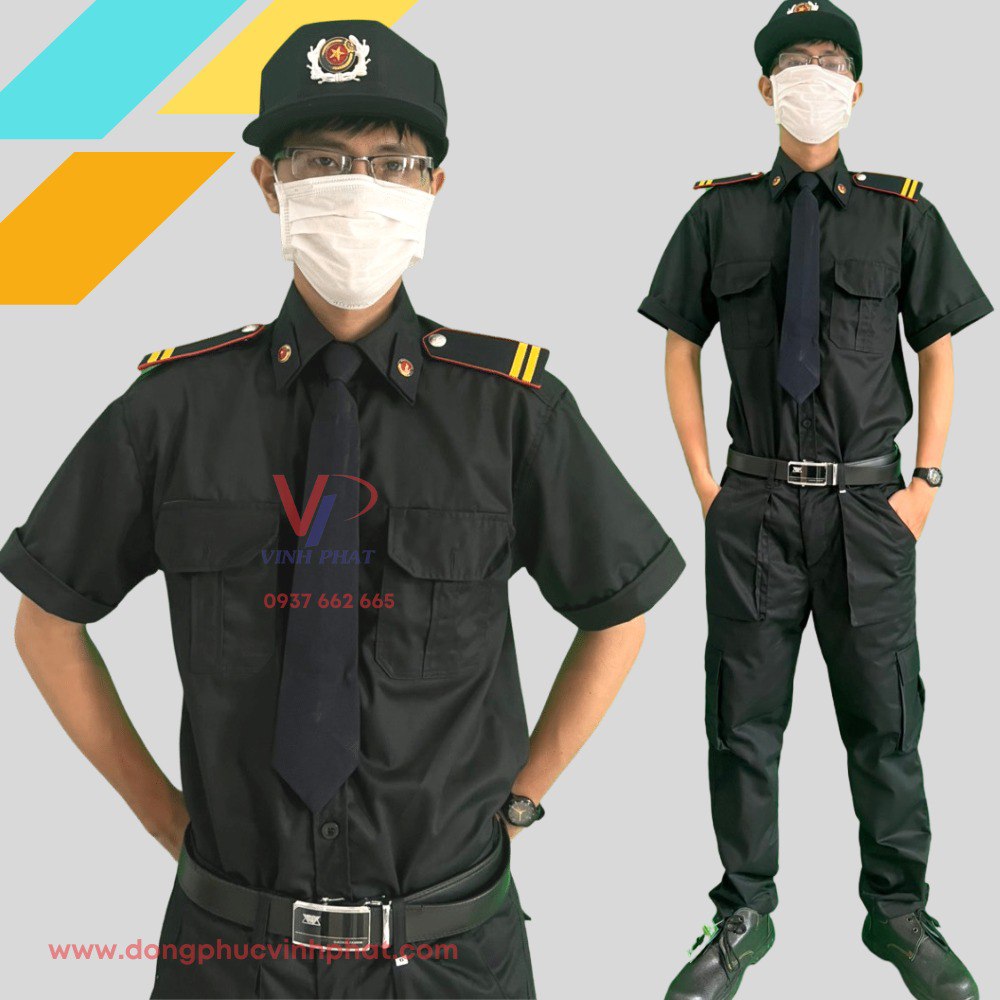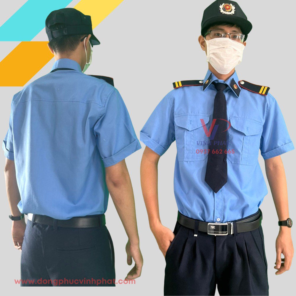 Hai bên vai có chiếc cầu vai để phân biệt chức vụ, ngoài ra 2 bên ngực áo được may 2 túi nắp giúp người bảo vệ có thể bỏ những vật dụng cần thiết, chuyên dụng trong quá trình làm việc, ve áo bảo vệ được cài trên phần bâu áo. Cà vạt xanh đen được thắt trên áo càng làm tăng thêm vẻ mạnh mẽ và nghiêm chỉnh cho người bảo vệ. Còn quần là quần tây kaki màu xanh đen nên dễ dàng kết hợp với mọi loại đồng phục và cũng tạo sự thoải mái rộng rãi cho người mặc.