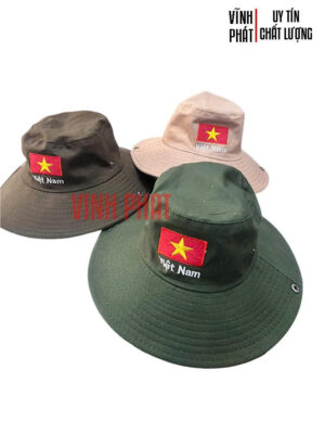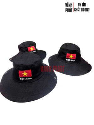 Nón Tai Bèo Vành Cong Cài Nút Hông Thêu Logo Lá Cờ Việt Nam có thiết kế tinh tế với gần như song song 2 kiểu nón khác nhau gồm nón tai bèo thời trang phổ biến và dạng nón cowboys vành cong.