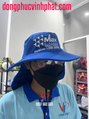 Nón tai bèo xanh phủ vành che nắng in logo Max Biotech có kiểu dáng theo dạng vành tròn lớn và phần vải che phía sau bao quanh có tác dụng che nắng và gió bụi vô cùng tốt. Nón còn được thiết kế thêm dây đeo để trong quá trình hoạt động nón sẽ không bị rơi ra ngoài.