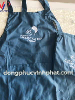 Khác với mẫu tạp dề lần trước tạp dề đồng phục quán trà sữa HEEKCA lần này được Vĩnh Phát chúng tôi may với chất liệu vải kaki 65/35 – chất vải dày dặn, cứng cáp, lên form chuẩn nhưng không kém phần mềm mại, thông thoáng và thoải mái cho người mặc.