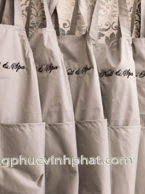 Tạp dề Nail của tiệm Star Nail & Spa đã được công ty may Vĩnh Phát chúng tôi may với chất vải dù màu xám giúp chống thấm tuyệt đối và mỏng hơn các loại vải khác nên khá thoải mái khi mặc. Về phần túi, tạp dề Nail được Vĩnh Phát thiết kế rộng hơn những chiếc tạp dề khác và được chia đôi túi bằng đường may chắc chắn giúp nhân viên có thể để đồ dùng cá nhân và dụng cụ làm việc. Một phần không thể thiếu của những chiếc tạp dề là logo của cửa hàng đã được thêu bằng chỉ màu đen với đường nét mềm mại và uyển chuyển.