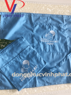 Tạp dề ngắn quán cafe TEA&COFFEE HEEKCAA lần này may với một chiếc tạp dề ngắn với nền vải màu xanh biển nhìn rất xinh xắn. Chất liệu vải dày dặn, mềm mịn và thoáng mát tạo cảm giác dễ chịu cho người mặc. Tạp dề được thiết kế với dây cột dài giúp cho mọi người với mọi kích cỡ đều mặc được. Phía trên tạp dề được may với một túi đắp rộng có thể đựng các vật dụng dễ dàng trong quá trình làm việc. Trên tạp dề được Vĩnh Phát chúng tôi in với logo màu trắng nổi bật trên nền xanh tạo điểm nhấn cho tạp dề.