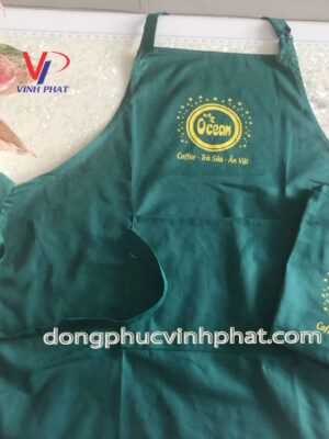 Tạp dề dài đồng phục quán ăn – trà sữa OCEAN được thiết kế dạng yếm có quai đeo ở cổ vả dây cột ở hông. Để may phù hợp với mọi chiều cao và vóc dáng của mọi người nên quai đeo ở cổ được Vĩnh Phát chúng tôi thiết kế với tăng đưa giúp điều chỉnh độ dài lên xuống một cách dễ dàng.