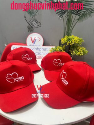 Nón kết đỏ CSR, mặt trước được in được logo, thông tin của đơn vị đặt hàng. Thiết kế dựa vào hình mẫu nón kết hiện đại với dáng vẻ lưỡi cong thể hiện được sự khỏe khoắn, nhanh nhẹn
